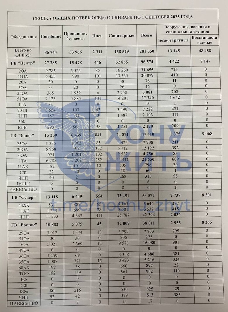 По данным украинского проекта “Хочу жить”, созданного при Главном управлении разведки Минобороны и работающего в рамках Координационного штаба по вопросам обращения с военнопленными, с января по август 2025-го года оккупационные войска потеряли 281550 военных — убитыми, ранеными и пропавшими без вести.