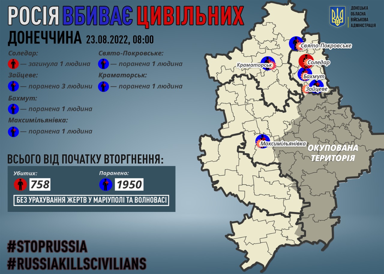 Глава Донецкой ОВА Павел Кириленко заявил, что 22-го августа россияне убили еще одного гражданского (в Соледаре), еще семеро – ранены: