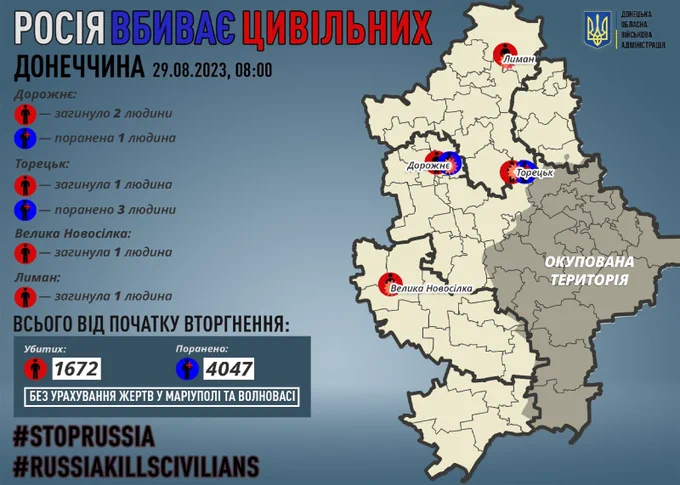 С 24-го февраля 2022-го года на Донетчине от рук российских оккупантов погибли 1672 ни в чем не повинных людей, 4047 – получили ранения, и это без страшной статистики из некоторых захваченных РФ городов, таких, как Мариуполь, где во время российских штурмов погибли тысячи невинных людей. Как сообщалось ранее, на оккупированной части Донецкой области в сводках заявлено о гибели 2 чел. в Горловке и Донецке, ранении здесь же 8 чел., повреждены 11 домов и 5 неизвестных инфраструктурных объектов.