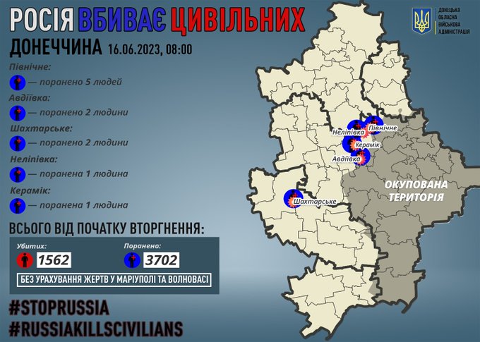 С 24-го февраля 2022-го года на Донетчине от рук российских оккупантов погибли 1562 ни в чем не повинных людей, 3702 – получили ранения, и это без страшной статистики из некоторых захваченных РФ городов, таких, как Мариуполь, где во время российских штурмов погибли тысячи невинных людей. Как сообщалось ранее, на оккупированной части Донецкой области в сводках было заявлено о ранении мужчины в Озеряновке, повреждении 10 домов в ЦГР Горловки и Киевском районе Донецка, а также одного неназванного инфраструктурного объекта.