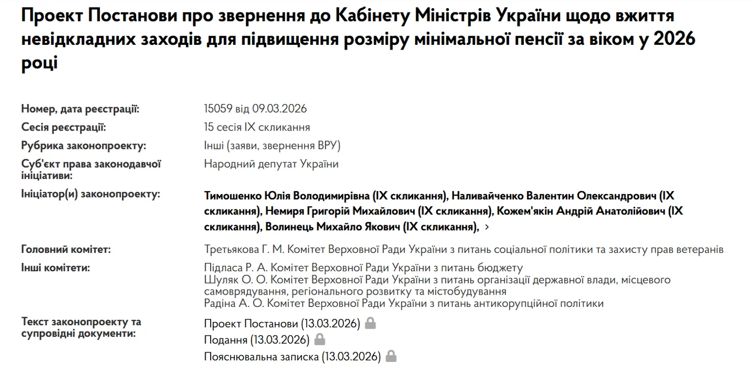 В Верховной Раде зарегистрирован проект постановления № 15059, предусматривающий повышение минимальной пенсии по возрасту уже в 2026-м году. Инициатива исходит от народных депутатов фракции «Батьківщина».