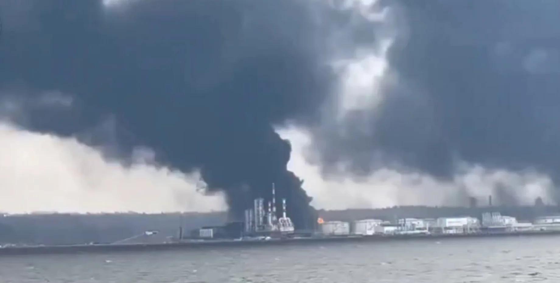 По данным российских пабликов, в результате атаки беспилотников в порту Усть-Луга загорелись пять резервуаров с мазутом и газовым конденсатом. Огонь охватил значительную часть терминала — площадь пожара превысила 15 тысяч квадратных метров!