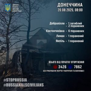 Всего с 24-го февраля 2022-го года на Донетчине от рук российских оккупантов погибли 3426 ни в чем не повинных людей, 7862 – получили ранения, и это без страшной статистики из ряда захваченных РФ городов, где во время варварских российских бомбежек и штурмов погибли тысячи невинных людей.