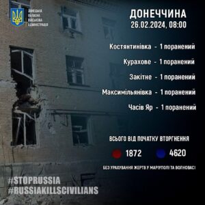 Всего с 24-го февраля 2022-го года на Донетчине от рук российских оккупантов погибли 1872 ни в чем не повинных людей, 4620 – получили ранения, и это без страшной статистики из некоторых захваченных РФ городов, где во время варварских российских бомбежек и штурмов погибли тысячи невинных людей. Как сегодня уже сообщалось, на оккупированной территории заявили о ранениях 3-х человек, повреждениях в захваченной части региона десяти домов и двух неизвестных “инфраструктурных объектов”.