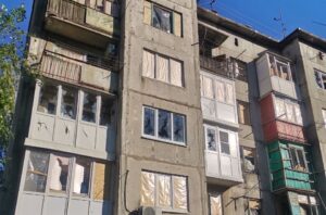 По версии так называемого “МЧС ДНР” остекление повреждено только в двух домах, а между ними – гараж. Но зато тут горела квартира (по факту – балкон) на верхнем этаже девятиэтажки.