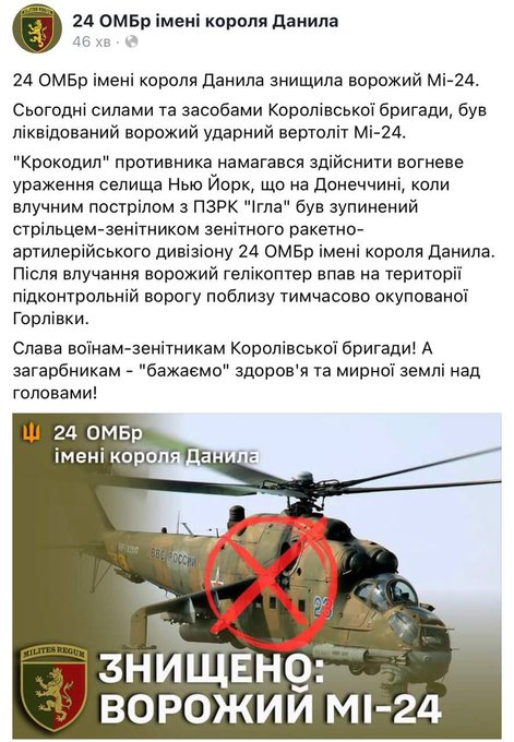 ДОНЕЦКАЯ ОБЛАСТЬ|Кочегарка. Как рассказали в 24-й отдельной механизированной бригаде имени короля Данила, украинскими защитниками был сбит российский ударный вертолет Ми-24 в районе Горловки.