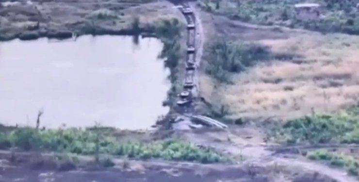 Приводится видео одной из таких колонн в районе Водяного, где головной танк россиян падает с моста.