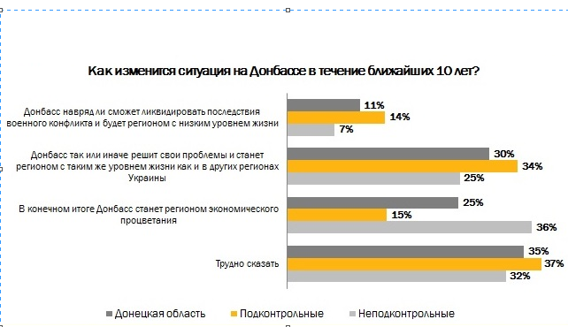 «Оценка перспективы сильно зависит от места проживания. Среди жителей неподконтрольных территорий наиболее распространено мнение, что Донбасс станет регионом экономического процветания. Таких 36%», – уточнил Паниотто.