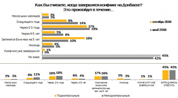 «Люди все меньше верят в скорое наступление мира на Донбассе. Почти половина жителей области не могут предположить, когда завершится конфликт. По сравнению с данными мая, сократилось число тех, кто надеется на окончание конфликта в течение следующего года (октябрь – 12%, май – 17%), но выросло число тех, кто считает, что конфликт потребует более 5 лет (октябрь – 16%, май – 10%)», – рассказал Владимир Паниотто, генеральный директор КМИС.