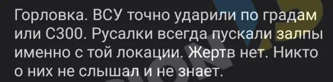 Что касается пророссийского сегмента соцсетей, то здесь подтверждали, что с утра над Горловкой кружила авиация, после чего начались прилеты в Зайцево и Никитовском районе. В частности, назывались ж/м Гагаринский, Комарова, Комсомольский, Ртутный, при этом про серию взрывов после полудня никто не писал.