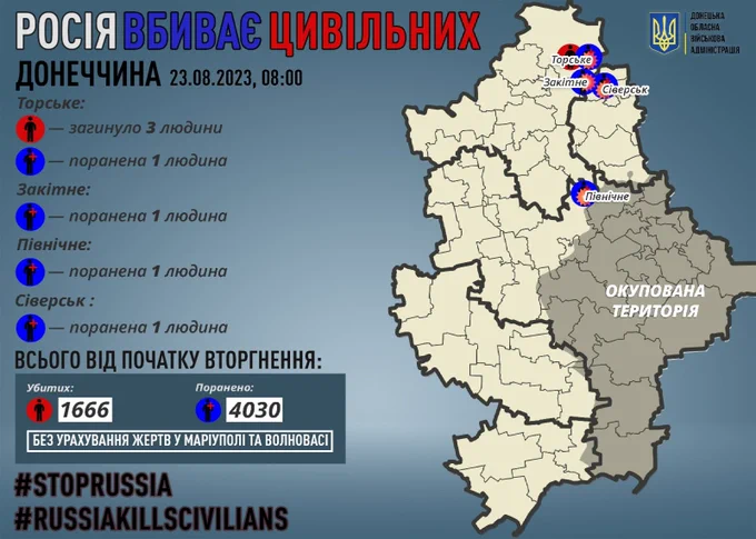 С 24-го февраля 2022-го года на Донетчине от рук российских оккупантов погибли 1666 ни в чем не повинных людей, 4030 – получили ранения, и это без страшной статистики из некоторых захваченных РФ городов, таких, как Мариуполь, где во время российских штурмов погибли тысячи невинных людей. Как сообщалось ранее, на оккупированной части Донецкой области в сводках заявлено об отсутствии жертв, то есть число обстрелов якобы растет, а пострадавших – уменьшается? Всего повреждения, опять же несмотря на большое число заявленных инцидентов, получили по одному дому в Кировском и Петровском районах Донецка, а также три неизвестных инфраструктурных объекта.