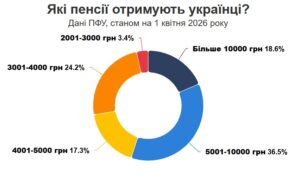 - высокие пенсии: почти 19 % граждан (1,86 млн. чел.) получают более десяти тысяч гривен. В этой категории средняя выплата достигает 16,5 тыс. грн.;