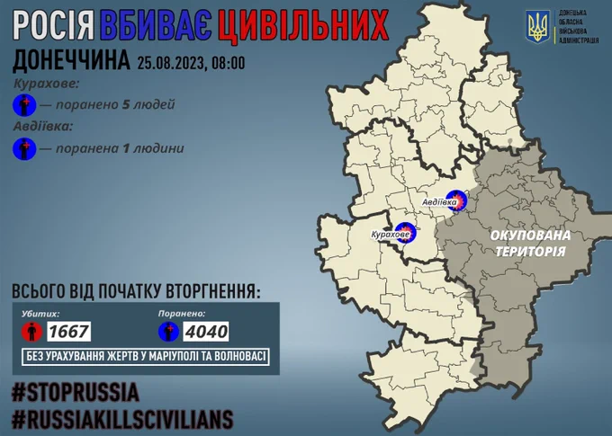 С 24-го февраля 2022-го года на Донетчине от рук российских оккупантов погибли 1667 ни в чем не повинных людей, 4040 – получили ранения, и это без страшной статистики из некоторых захваченных РФ городов, таких, как Мариуполь, где во время российских штурмов погибли тысячи невинных людей. Как сообщалось ранее, на оккупированной части Донецкой области в сводках заявлено о гибели женщины в Донецке, где также пострадали четверо. Всего повреждения получили 13 домов в Александровке, Донецке и Старомихайловке, шесть неизвестных инфраструктурных объектов.