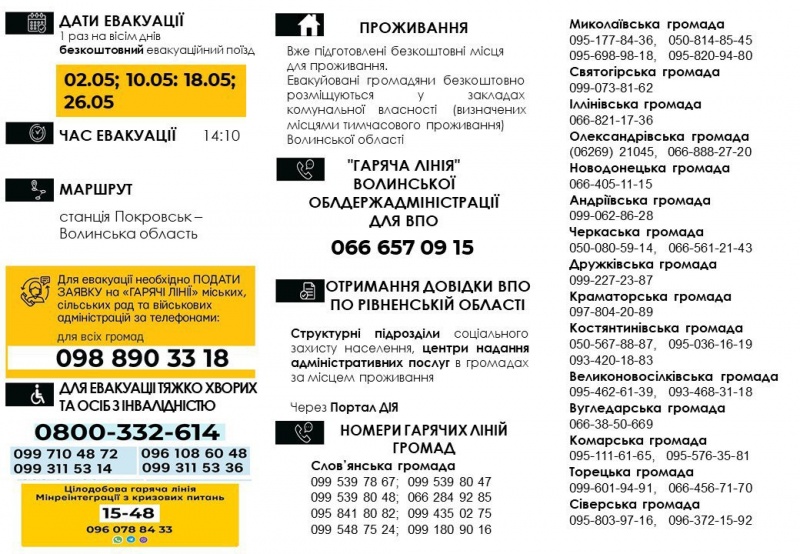 “Продолжается обязательная эвакуация гражданских жителей Донетчины. Сегодня самое важное – сохранить жизнь! Согласно решению правительственного Координационного штаба с 2 мая 2024 года обязательная эвакуация будет производиться в Волынскую область. Эвакуация будет осуществляться специальным поездом, 1 раз в 8 дней”, – говорится в сообщении ДонОВА.