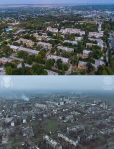 Здесь отмечается, что российская агрессия превратила некогда оживленный город в линию фронта.