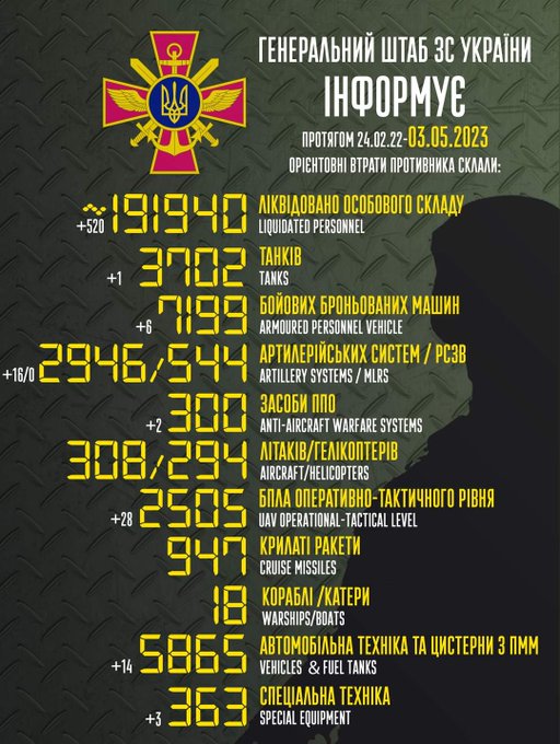 Сегодня, 3-го мая, в пресс-центре Генерального штаба ВСУ заявили, что потери оккупационной армии Кремля на территории Украины составляют уже порядка 192-х тыс. чел.