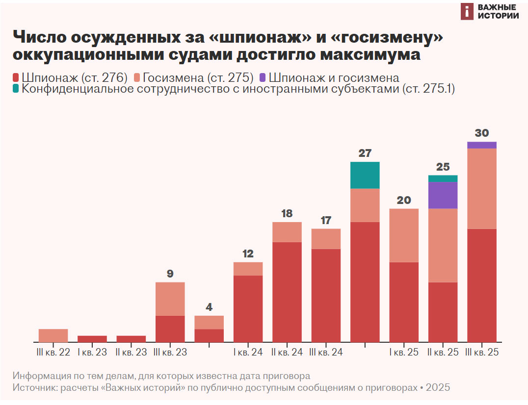 До начала войны РФ выносила не более 16-ти приговоров в год по статьям о госизмене (от 12-ти до 20-ти лет или пожизненно) и шпионаже (от 10-ти до 20-ти лет лишения свободы). В 2022-м году в Уголовный кодекс добавили еще одну статью — “конфиденциальное сотрудничество с иностранным государством”, за которую предусмотрено от трех до восьми лет тюрьмы.