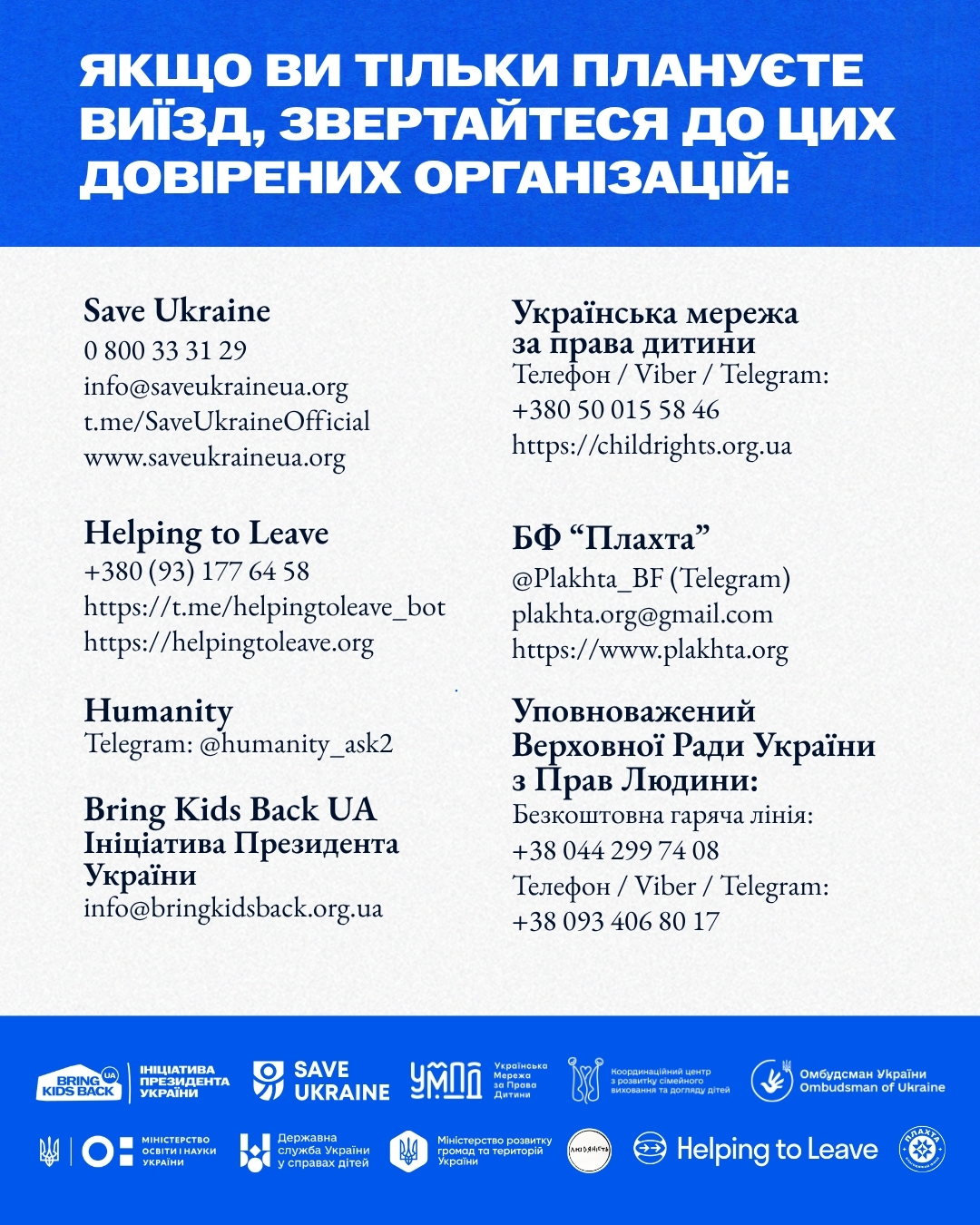 Если вы только планируете выезд, можно обратиться за помощью в рамках инициативы Bring Kids Back UA — там помогают выехать бесплатно, конфиденциально и с полным сопровождением, даже при отсутствии документов. Для каждого подбирается безопасный маршрут.