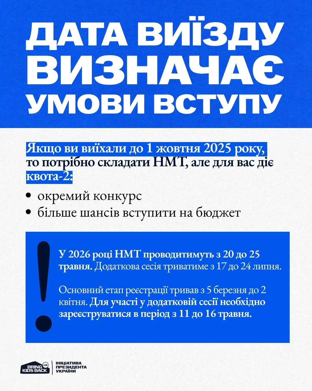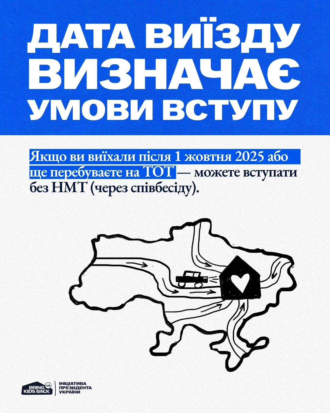 Условия поступления зависят от даты выезда. Если абитуриент остается на ВОТ или выехал после 1-го октября 2025-го года — он может поступать без НМТ, через собеседование в университете. Если выезд был раньше — необходимы результаты НМТ, однако действует квота-2.