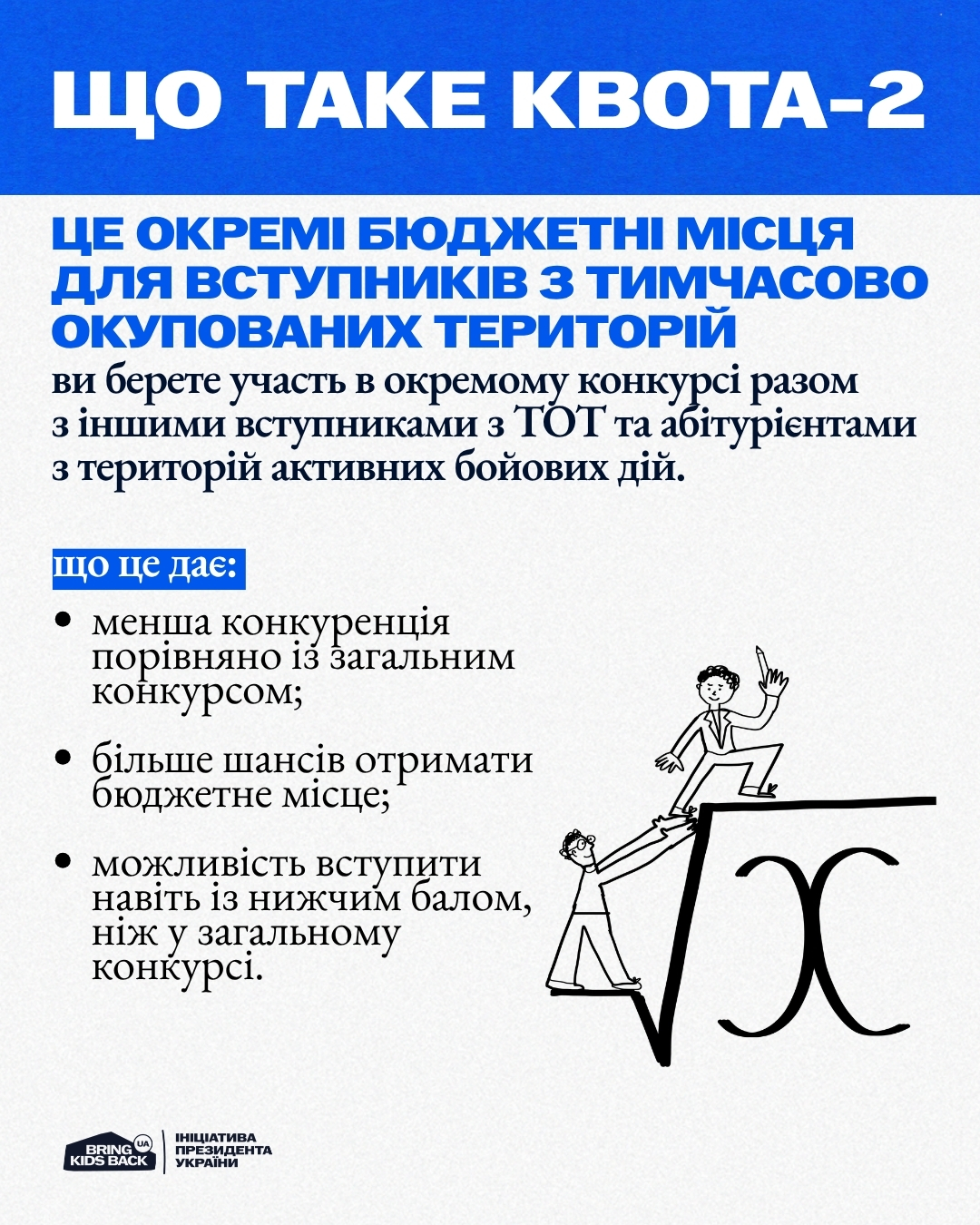 Квота-2 — это отдельные бюджетные места для поступающих с ВОТ и территорий активных боевых действий. Конкурс проходит отдельно, что повышает шансы на получение бюджетного места. В большинстве университетов это около десяти процентов мест, а в перемещенных или прифронтовых — до сорока процентов.