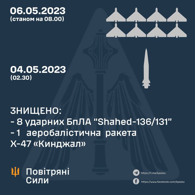 «Около 02:30 в небе Киевщины зенитно-ракетным комплексом Patriot уничтожена аэробалистическая ракета Х-47 “Кинжал”, запущенная с МиГ-31К с территории России».