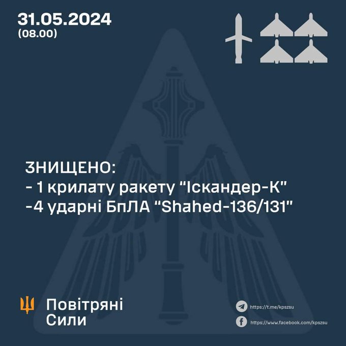 Позднее появилась информация о пусках со стороны Белгородской области пяти зенитных управляемых ракет С-300/С-400 по Харькову и одной крылатой ракеты Искандер-К – со стороны Курской области по Киевщине. Ее сбили уже над Киевом, в результате падения обломков есть повреждения трансформаторной подстанции, произошел пожар.